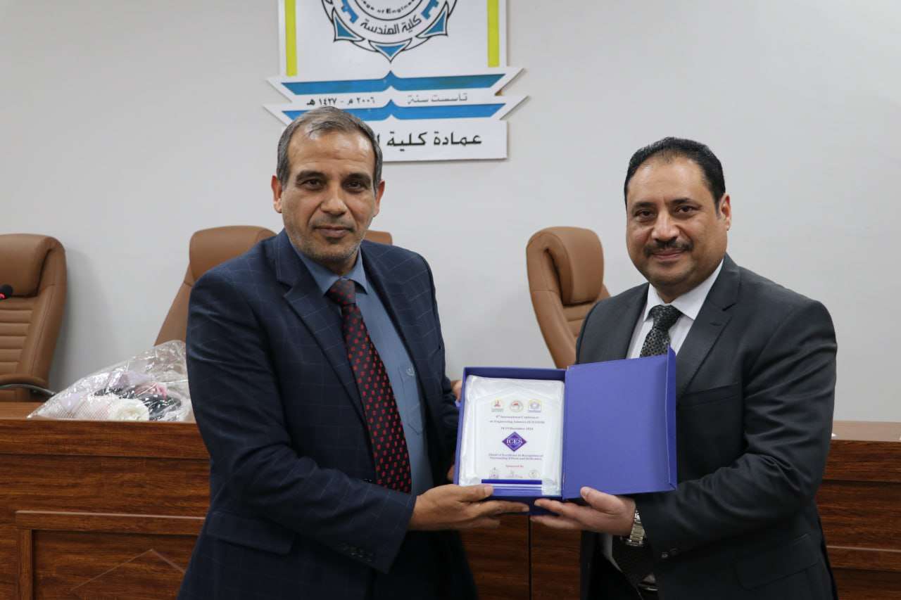 كرم الاستاذ الدكتور حيدر ناظم عزيز المحنه عميد كلية الهندسة الاستاذ الدكتور مسلم محسن علي درع تكريم من الكلية وشهادة تقديرية .